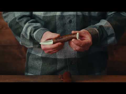 Die Klinge besteht aus UHC-Stahl (Ultra High Carbon) und der verzierte Griff aus Rentiergeweih ist aus stabilisierter, gebeizter Maserbirke gefertigt und mit Leinöl behandelt – für einen sicheren Griff, auch bei Nässe. Geliefert wird das Messer mit einer handgefertigten Scheide aus dunkel pflanzlich gegerbtem finnischem Leder in Kombination mit gebeizter Maserbirke – für ein einzigartiges Erscheinungsbild. Gefertigt, geschärft und perfektioniert in Zusammenarbeit mit dem Messermacher Kari Ohtonen.