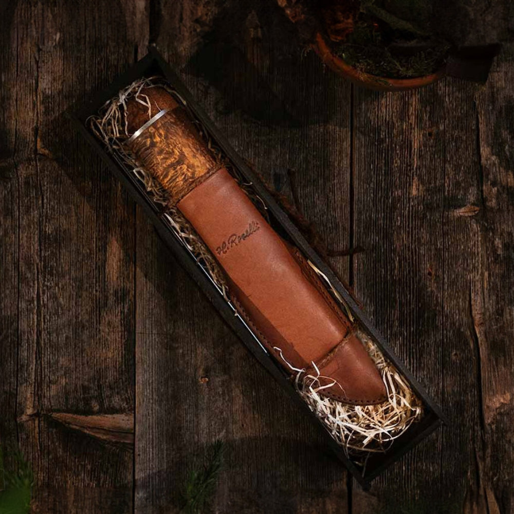 Our products are made from the finest natural materials and raw materials that follow the highest ethical standards. High-quality carbon steel, Finnish curly birch and Finnish natural tanned leather form the basis of all our products. Our locally produced, organic and ethical leather comes from free animals and has been vegetable tanned where only organic material is used instead of destructive chemicals.